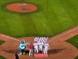 ヒーローインタビューには、3点ホームランを打った「モンテロ選手」、長打等で3打点の「末包選手」、ピンチヒッターで2打点を挙げた新人「前川選手」の3選手である。