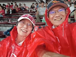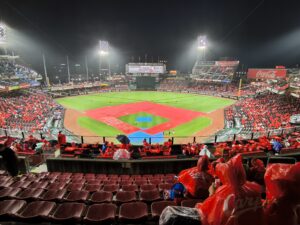 球場に着くとコンコース内は結構多くの観客がたむろしているが、スタンドに座っているのはまだ少ない。傘を差しているより、球団の販売商品である真っ赤なポンチョを着ている観客が多い。