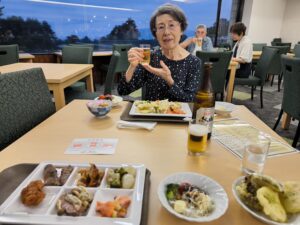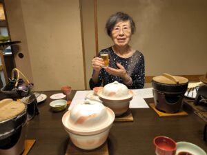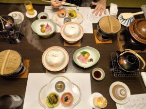 食事は個室で仲居さん付き。ツアー旅行でこういうのは初めてである。純和食の懐石膳(〇食事欄に記述)は、一品ごとに食べごろを見定めてもらえる感覚は久しぶり。