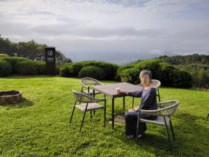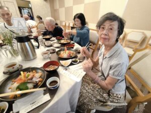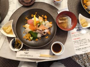 昼食はふもとの金誠館で13種の海鮮丼(〇食事欄に記述)を円卓でいただく。