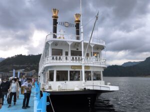 その後、到着は奥只見湖。遊覧船に乗り碧と緑の美しいコントラストを楽しむ。40分ほどの乗船。ここで少しばかり雨に降られた。