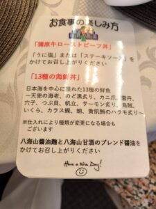 昼食 海老、のどくろ炙りなどが入った「13種の海鮮丼」または新潟ブランド牛「神原牛雲丹まみれ丼」 私たちは「13種の海鮮丼」を食した。 金誠館